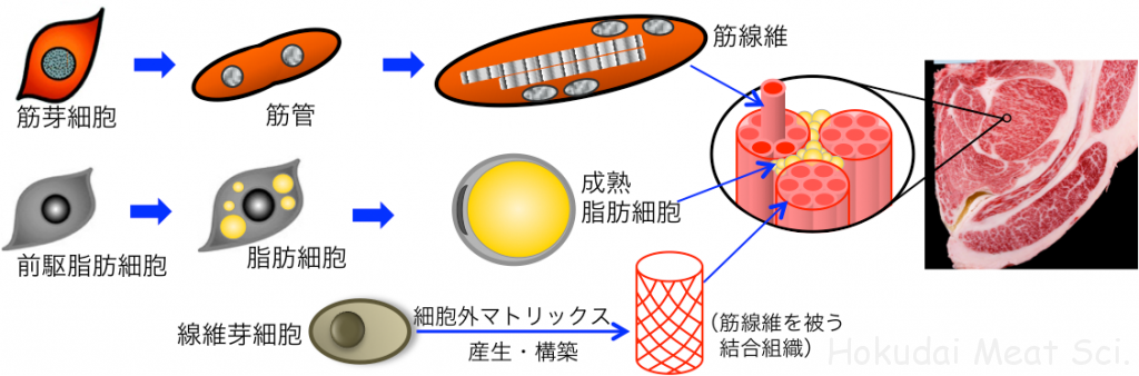 作られ方も先ほどの筋芽細胞とは異なっています。脂肪細胞という組織が、中に脂肪を取り込み、貯蔵していく、という仕組みになっています。また、必要になときに分解され、全身に栄養を供給することができるようになっています。