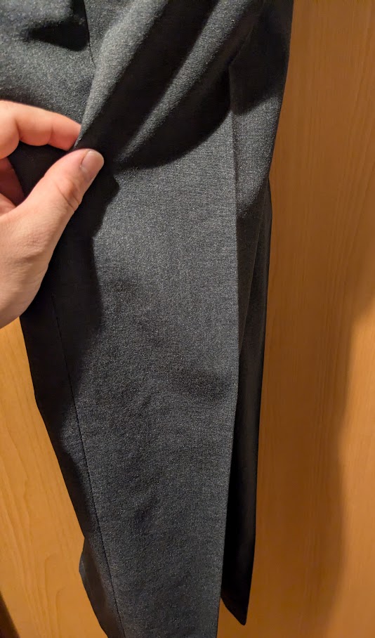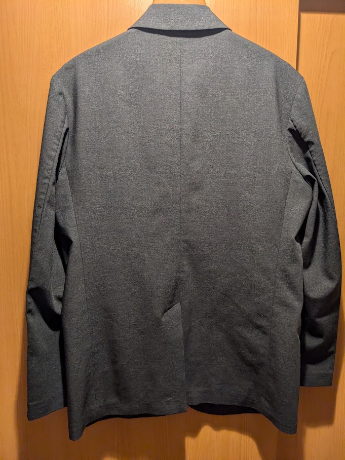 こちらがが筆者の感動ジャケットと感動パンツ、ダークグレー。使用は2年ほどです。ご覧の通り、シワはほぼ気になりません。もしついててももう一度洗濯すれば大丈夫です。