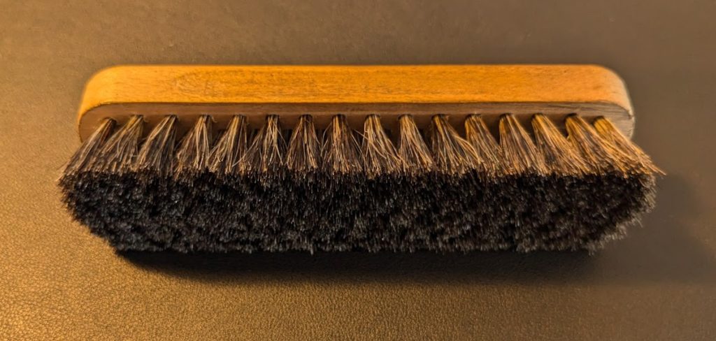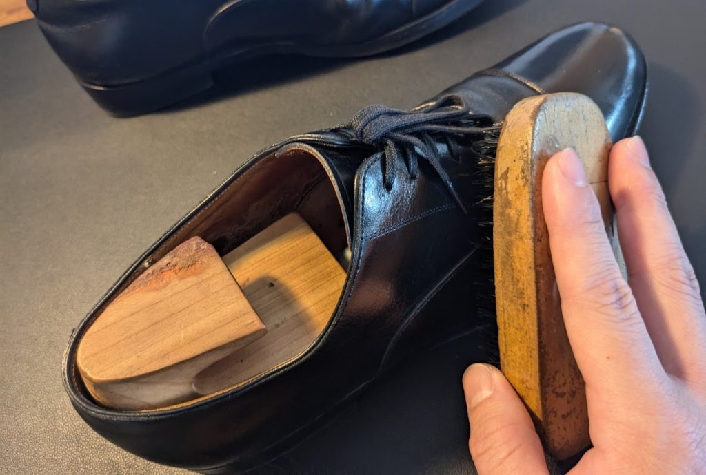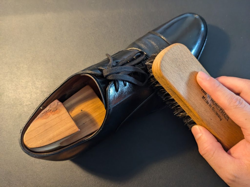 まずは馬毛ブラシでのブラッシングです。1日履いて、ついたホコリをしっかり落としておきましょう。場合によってはこの工程だけでも十分なくらいです。