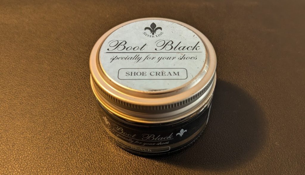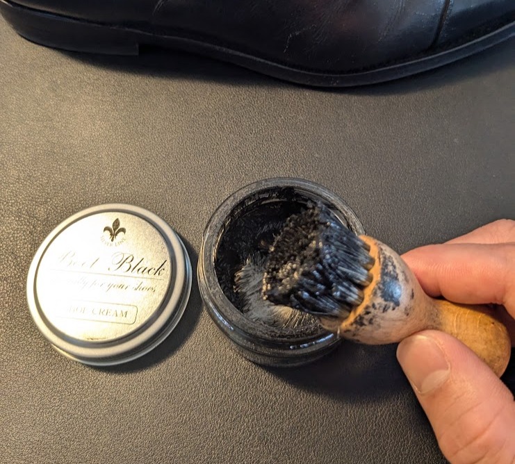続いて靴クリームを塗っていきます。これが手入れのメインと言える工程です。靴クリーム用のブラシに枝豆くらいの大きさでクリームを取り、靴に塗り広げていきます。